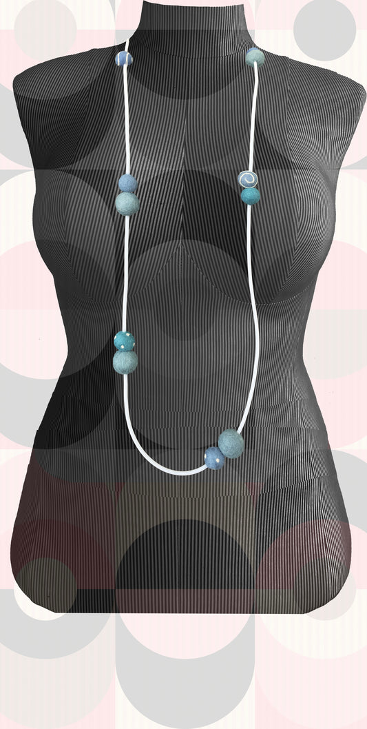 Modern Long Single/Double Strand White Rubber Necklace With 11 Blue-Color Wool Felt Balls