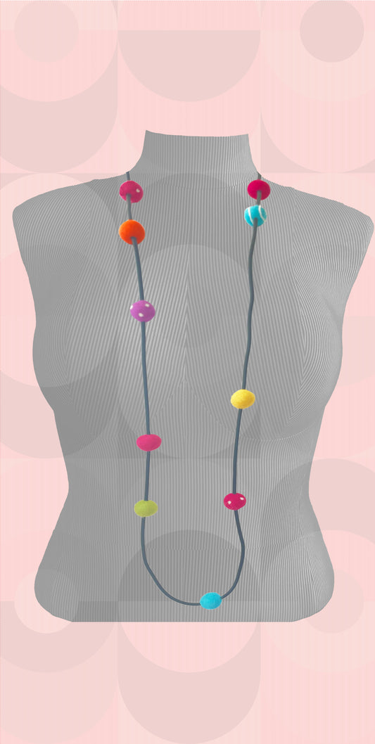 Modern Long Single Strand Gray Rubber Necklace With 9 Multi-Color Wool Felt Balls
