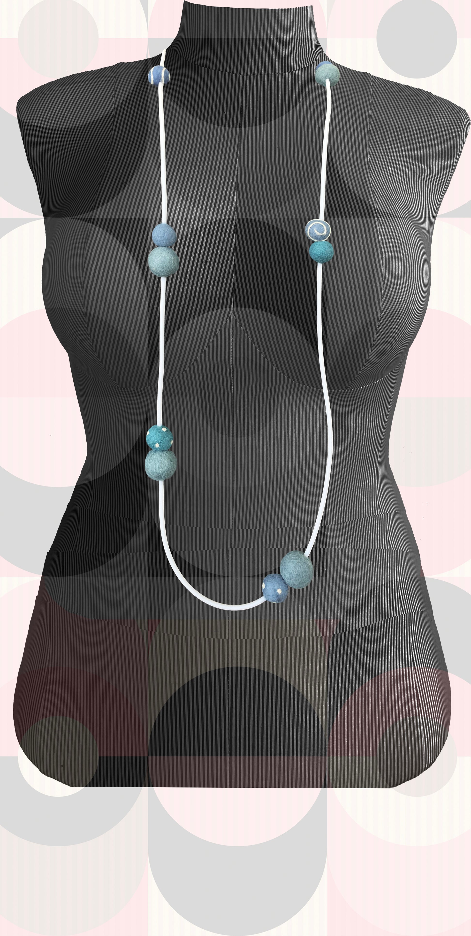 Eleven blue shades of color wool felt balls are strung on a single-strand white rubber necklace in an asymmetrical pattern. Length is approx. 34” long as a single strand. Can also be worn as a double strand. Stylish design is lightweight, easy to wear and a smart jewelry piece for travel or packing. Custom colors and lengths are also available if you have something else in mind!
