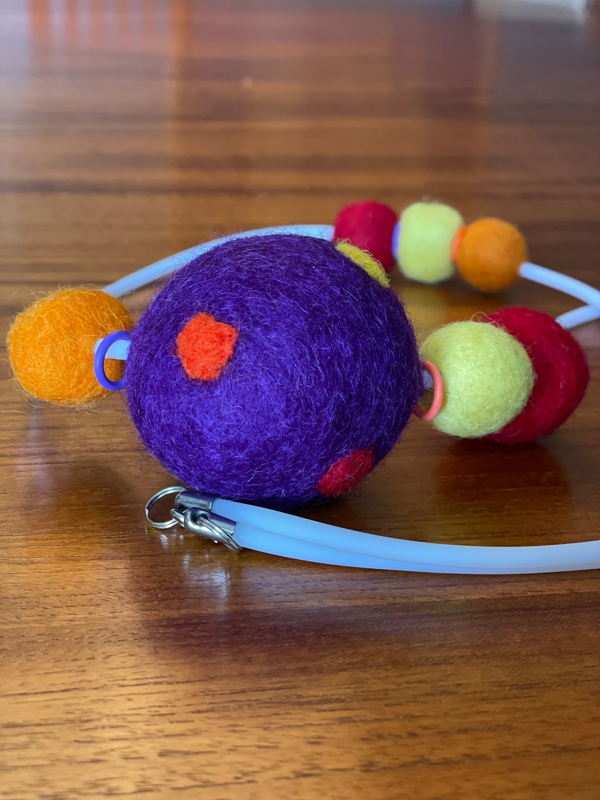 Seven pastel felt balls are strung on a single-strand white rubber necklace in an asymmetrical pattern. Length is approx. 22”. Stylish design is lightweight, easy to wear and a smart jewelry piece for travel or packing. Custom colors and lengths are also available if you have something else in mind!